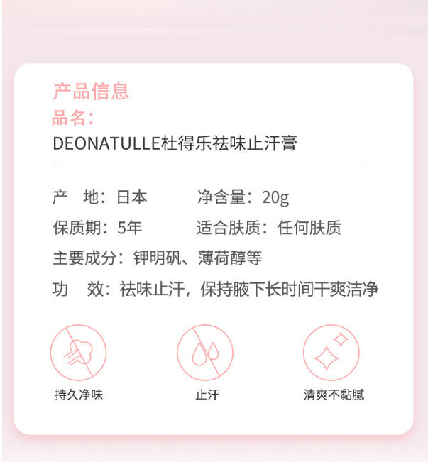日本进口Deonatulle杜得乐止汗石20g腋下干爽止汗石祛异味祛狐臭腋臭消臭固体止汗剂走珠净味膏