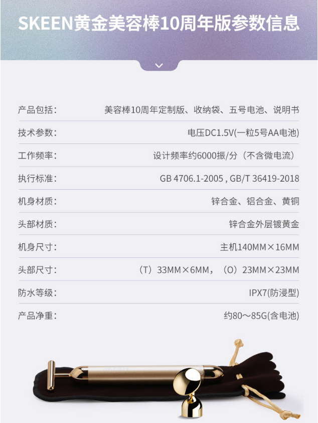 包装清单:定制版黄金美容棒x1、产品收纳袋x1、说明书(含保修卡)x1、五号电池x1